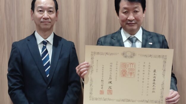 巖本商事株式会社様に、国の紺綬褒章を伝達しました